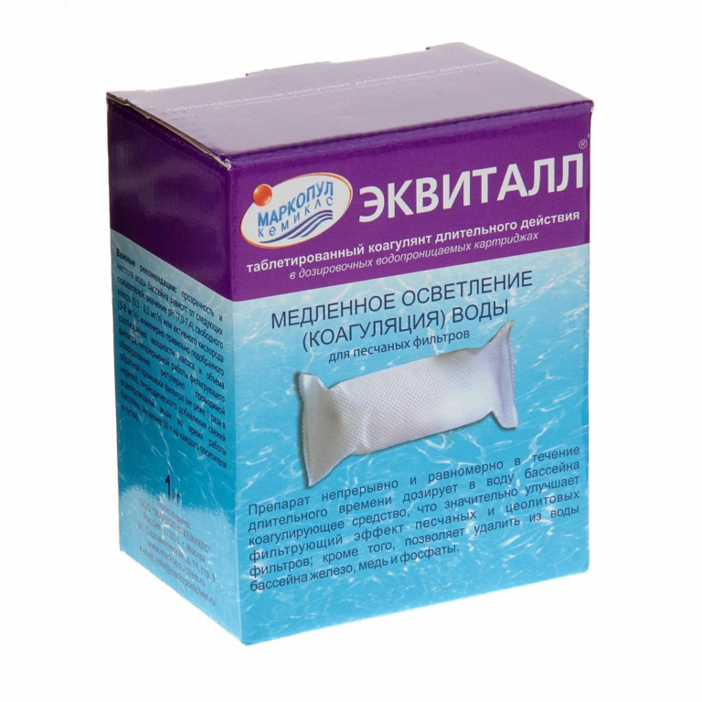 Эквиталл таблетированный медленного действия несколько отличается от других препаратов для коагуляции. Благодаря своей медленной растворимости препарат равномерно дозирует в воду бассейна коагулирующее средство в течение длительного времени. Это положительно влияет на фильтрационный эффект песчаных фильтров. В процессе циркуляции воды непрерывно отфильтровываются мелкие частицы. Также Эквиталл длительного действия удаляет из воды железо, медь, фосфаты. В составе алюминия полиоксихлорид.